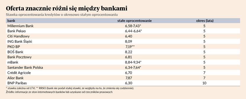 Oprocentowanie kredytów hipotecznych ze stałą stopą zależy przede wszystkim od marży banku i wskaźnika LTV, który wyraża stosunek kwoty kredytu do wartości zabezpieczenia, czyli nieruchomości. Najniższe oprocentowanie w przypadku zamrożenia stawki na pięć lat oferują obecnie bank Santander (od 6,34 proc.) i Citi Handlowy (6,4 proc.). Relatywnie niskie jest oprocentowanie w banku Pekao - jeśli wskaźnik LTV nie przekracza 80 proc., to stawka wynosi 6,44 proc. - oraz w Millennium, gdzie dla LTV poniżej 60 proc. oprocentowanie to 6,58 proc. Najwięcej kredytobiorca zapłaci w mBanku, gdzie zgodnie ze standardową ofertą oprocentowanie zaczyna się od 8,84 proc. W przypadku kredytów siedmioletnich Alior Bank oferuje oprocentowanie zaczynające się od 7,87 proc., a Crédit Agricole od 6,7 proc. Warto jednak zaznaczyć, że ze względu na regularne podwyżki stóp procentowych i niestabilne otoczenie makroekonomiczne cenniki banków ulegają obecnie częstym zmianom.