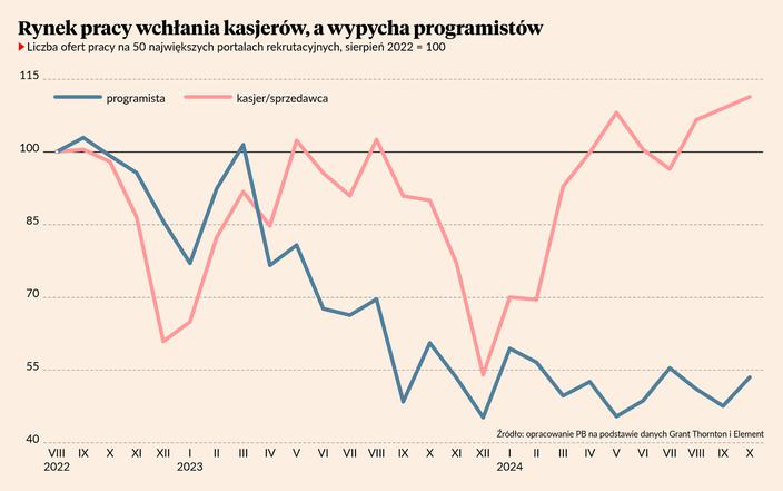 Weźmy programistów i kasjerów, czyli zawody, w których zarówno wymagane kompetencje, jak i sposób pracy diametralnie się różnią. Według danych GT liczba ofert pracy dla programistów jest w trendzie spadkowym. Średnioroczny spadek w miesiącach styczeń-październik 2024 r. w stosunku do analogicznego okresu 2023 r. to aż 29,8 proc. A warto zauważyć, że już w poprzednim roku popyt na pracowników IT malał. Jednocześnie popyt na kasjerów rośnie w tym roku w tempie 7,6 proc. Co ciekawe, liczba ofert pracy jest w ich przypadku większa niż w 2022 roku, gdy trwał boom na towary. Rośnie też popyt na inne prace, które nie wymagają wysokich zdolności kognitywnych - kierowców i magazynierów.