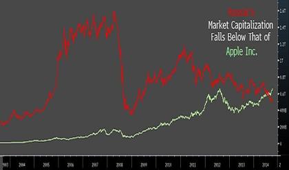 Wartość rynkowa Gazpromu, Aerofłotu, Sberbanku i innych spółek notowanych na giełdzie w Moskwie spadła od początku roku o 30,6 proc. do 531 mld USD. To mniej niż wynosi kapitalizacja jednej tylko – ale za to największej – spółki amerykańskiej: Apple. Technologiczny gigant zyskał w 2014 r. na wartości 147 mld USD i jest już o 121 mld USD więcej wart od całego rynku rosyjskiego.