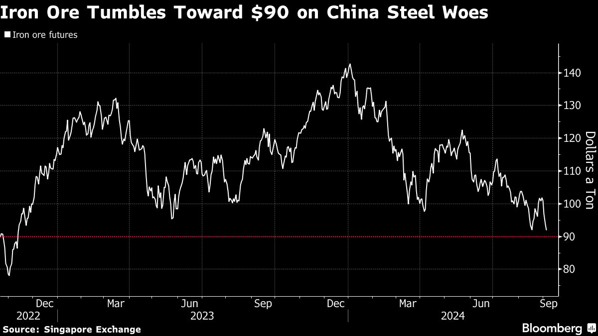 Kontrakty terminowe na żelazo spadają w środę o około 1,7 proc., kształtując się na pułapie 92 USD za tonę, realizując czwarty z rzędu spadek. Kurs zmierza w stronę ważnego poziomu wsparcia na poziomie 90 USD.