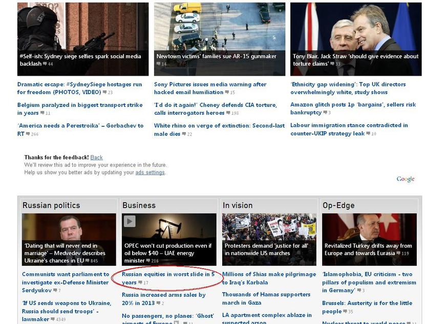 Ze strony głównej RT.com można dowiedzieć się jedynie o przecenie na rosyjskiej giełdzie, gdzie indeks RTS załamał się o ponad 10 proc. W lakonicznej relacji można przeczytać o skoku notowań dolara do poziomu 62 rubli oraz o tym, że sytuacji przeciwdziałać miały posunięcia Banku Rosji, który w ubiegłym tygodniu podniósł stopę główną stopę procentową do 10,5 proc.