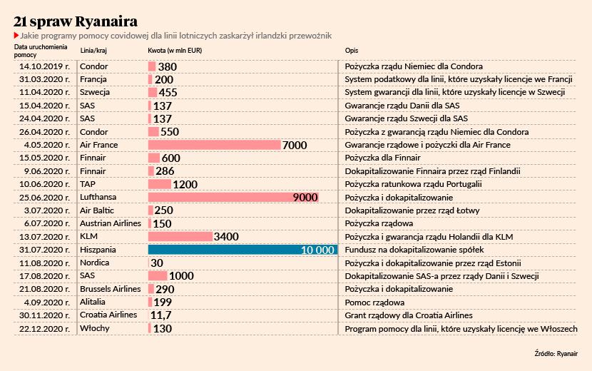 Apetyt Ryanaira mogły rozbudzić pierwsze pozytywne dla Irlandczyków decyzje. Trybunał z Luksemburga anulował 19 maja zgodę KE na pomoc dla KLM i TAP. Zwrot pomocy jest zawieszony do czasu ogłoszenia przez KE nowych decyzji, co ma nastąpić w ciągu dwóch miesięcy. KLM i TAP mogą apelować. W przypadku KLM chodziło o 3,4 mld EUR pożyczki i gwarancji. Ryanair argumentował, że ponieważ wcześniej pomoc dostała Air France (7 mld EUR), więc należące do tej samej grupy KLM również mogły z niej skorzystać. Wydając decyzję KE nie brała tego pod uwagę. W przypadku portugalskich linii chodziło o gwarancję i pożyczkę z bardzo korzystnym oprocentowaniem o łącznej wysokości 1,2 mld EUR. Ryanair jest głównym konkurentem portugalskiego przewoźnika narodowego, w 2019 r. miał na tym rynku 10,9 mln pasażerów.