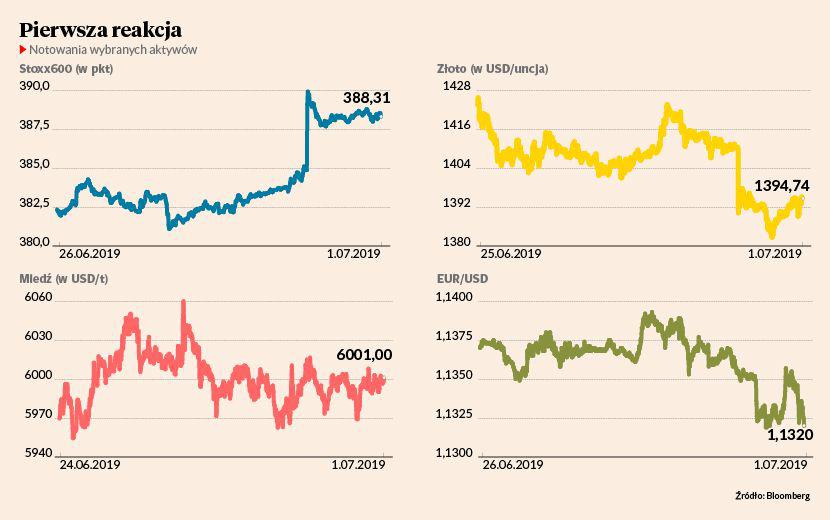 Wcześniej na rezultat weekendowego szczytu G20 w Osace miały szansę zareagować parkiety azjatyckie. Japoński Nikkei 225 i chiński Shanghai Composite podczas poniedziałkowej sesji zyskały ponad 2 proc. Nieco słabiej rosły indeksy europejskie — o ponad jeden procent wybiły się FTSE 100 i DAX. Również na warszawskiej giełdzie doszło do niewielkiej, ale jednak zwyżki notowań. Reakcja na świecie była jednoznacznie pozytywna, mimo że z ust najważniejszych przywódców padły dość mętne sformułowania dotyczące raczej utrzymania statusu quo niż deeskalacji konfliktu.