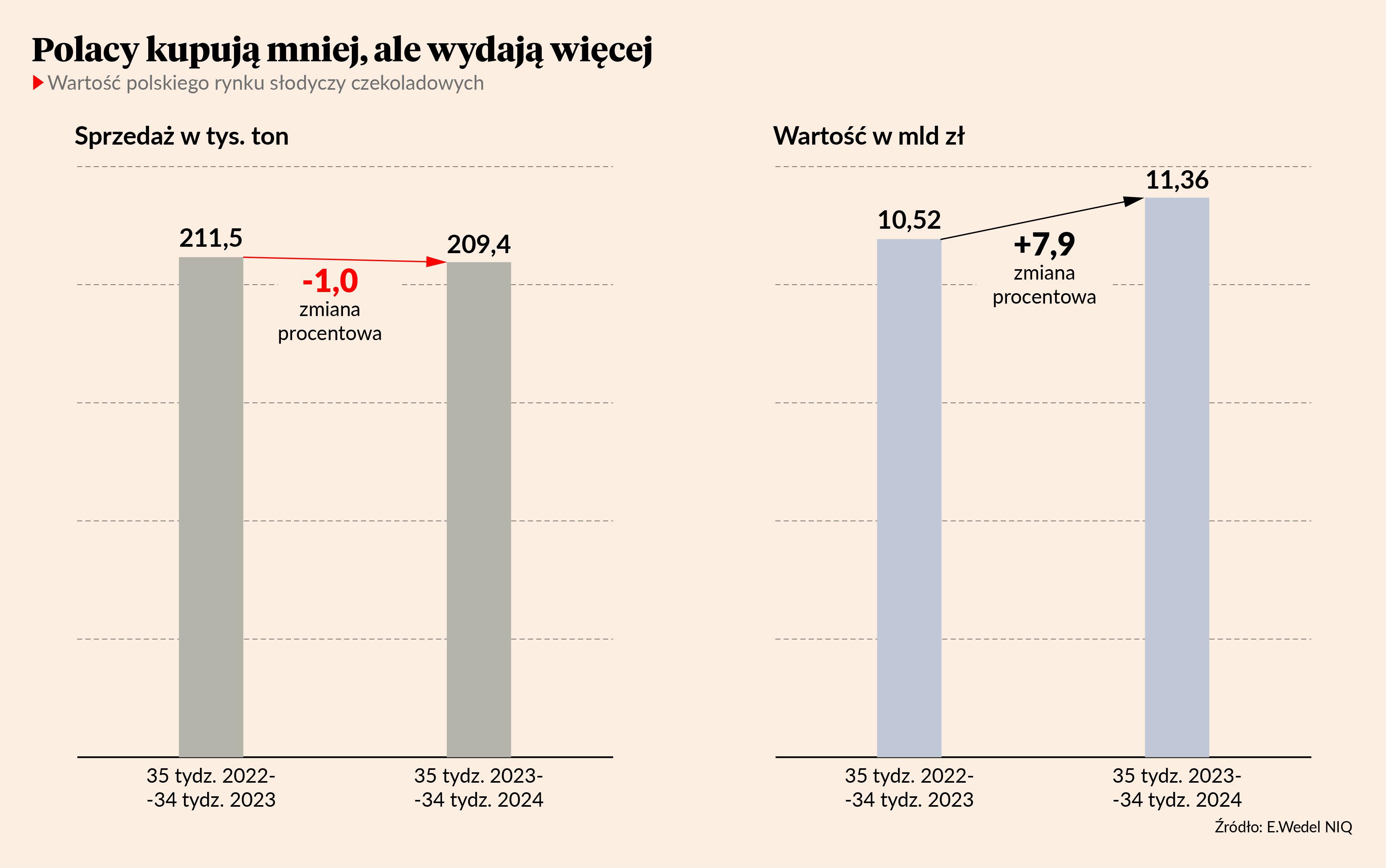 W ujęciu wartościowym polski rynek czekolady w okresie od września 2023 do września 2024 był wart prawie 11,4 mld zł, podczas gdy rok wcześniej było to 10,5 mld zł. W tym samym czasie jej spożycie po raz pierwszy od lat spadło – z 211,5 tys. ton do 209,4 tys. ton – wynika z danych firmy Wedel i firmy badawczej NIQ.