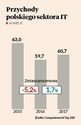 W rankingu największych firm sektora IT spośród 387 przedsiębiorstw aż 257 powiększyło przychody, a 111 odnotowało ich spadek (19 pozostałych występuje w zestawieniu po raz pierwszy bądź nie odnotowało zmiany przychodów). Firm rosnących jest więc ponad dwa razy więcej niż tych o malejących przychodach. Jednak w pierwszej pięćdziesiątce sytuacja jest zgoła odmienna: rosnących jest więcej zaledwie połowę: 29 firm rośnie, 20 spada, jedna, powstałe na początku 2017 r. DXC Technology, debiutuje w rankingu. Firmy o mniejszych przychodach, w dalszej części rankingu, radziły sobie relatywnie lepiej, ale nie były w stanie nadrobić tego, co straciły największe.