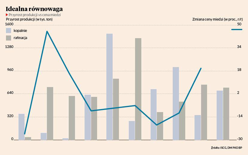 W 2017 r. wydobycie miedzi wzrośnie o zaledwie 1-2 proc., prognozuje w najnowszym raporcie dotyczącym KGHM Artur Iwański, analityk DM PKO BP. Choć produkcja miedzi rafinowanej wzrośnie trochę mocniej, bo o 3-4 proc., to jednak przy wzroście popytu o 3 proc. rynek osiągnie równowagę, zapowiada specjalista. To każe sądzić, że skok cen rudego metalu z końca 2016 r. zostanie utrzymany. Nadwyżka podaży utrzymywała się wcześniej przez siedem lat z rzędu, a to prowadziło do wzrostu zapasów.