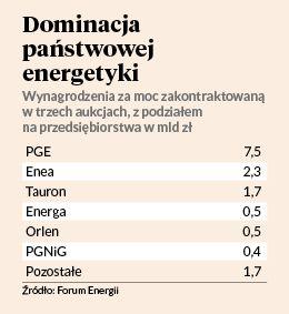 Prognozy Ministerstwa Energii wskazywały, że rynek mocy będzie kosztował odbiorców (bo opłata mocowa będzie od 2021 r. doliczana do rachunku za prąd) ok. 4 mld zł rocznie. Tymczasem po trzech pierwszych aukcjach widać już, że koszt w latach 2021, 2022 i 2023 wyniesie nieco ponad 5 mld zł rocznie. Lwia część tej kwoty trafi do kontrolowanej przez państwo PGE, największego wytwórcy energii w Polsce. Forum Energii wyliczyło, że przez trzy lata gigant zainkasuje 7,5 mld zł. Następne w rankingu Enea i Tauron, też państwowe, dostaną odpowiednio 2,3 i 1,7 mld zł. Wyliczenia Forum Energii wskazują też, że pieniądze popłyną przede wszystkim do istniejących bloków węglowych. Ich udział w mocach zakontraktowanych na 2023 r. wynosi prawie 83 proc. Jedynym nowym źródłem węglowym, które uzyskało wsparcie, jest blok budowany w Ostrołęce. Nowych źródeł gazowych jeszcze nie zgłoszono.