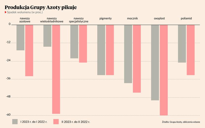 Już w styczniu skala produkcji wszystkich substancji, które ma w portfolio Grupa Azoty, była – w najlepszym wypadku - o kilkanaście procent niższa niż rok wcześniej. O tyle skurczyła się produkcja nawozów azotowych oraz wieloskładnikowych (tzw. NPK). Najmocniej (prawie o 40 proc.) spadło wytwarzanie mocznika zarówno do celów rolniczych, jak technicznych, oraz oxoplastu, czyli plastyfikatora będącego dodatkiem do polichlorku winylu (50 proc.). Luty był pod tym względem jeszcze gorszy: najmniej — tylko o jedną czwartą — spadła produkcja nawozów specjalistycznych, a najgorzej miały się nawozy NPK i oxoplast, których wytworzono w zakładach Grupy Azoty o około 60 proc. mniej niż w lutym 2022 r.