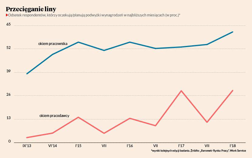 Racjonalność postulatów wysuwanych przez jedną i drugą stronę leży w naszym wspólnym interesie, bo niekontrolowany wzrost presji płacowej nadwyręża firmowe budżety, a przez mechanizm inflacyjny prowadzi do przegrzania całej gospodarki. Każda strona chce jednak ugrać więcej dla siebie. 55 proc. respondentów badania WS przyznało, że w ciągu ostatnich 12 miesięcy otrzymało podwyżkę, 26,5 proc. stwierdziło, że zaproponował ją pracodawca, a 67,4 proc. — że nie miało to związku ze wzrostem płacy minimalnej. Te statystyki sugerują, że w rynkowych rozgrywkach jest 2:1 dla pracowników.