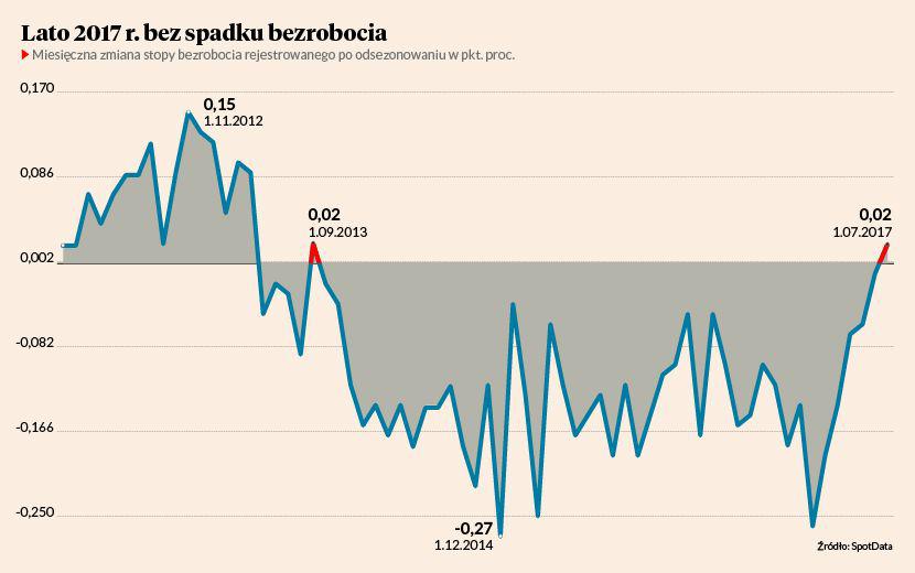 Ostatni raz bezrobocie nie spadło między czerwcem a lipcem w 2012 r., a więc w szczycie kryzysu finansowego w strefie euro, gdy firmy ze strachu ograniczały skalę aktywności. Z szacunków SpotData wynika, że kiedy z danych usunie się efekty zmian sezonowych, to ostatni raz stopa bezrobocia nie spadła z miesiąca na miesiąc we wrześniu 2013 r. Wtedy polska gospodarka bardzo powoli wychodziła z dołka koniunktury. Co się zatem stało w lipcu 2017 r.?