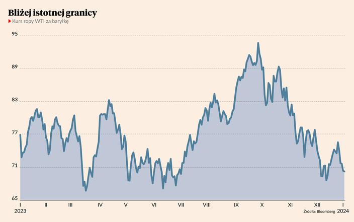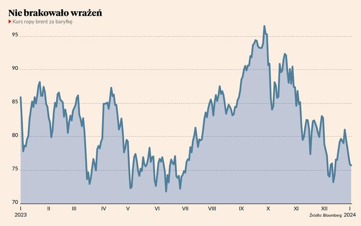 W ubiegłym roku cena ropy Brent skurczyła się o ponad 10 proc. Cena baryłki wynosi już tylko 76 USD, mimo że nie dalej jak dwa miesiące temu przekraczała 90 USD. Głównym powodem spadku były doniesienia z listopadowej konferencji OPEC+. Rynek liczył na istotne ograniczenie podaży i mimo, że zostało ono potwierdzone – na styczeń 2024 r. zapowiedziano cięcie wydobycia o 900 tys. baryłek dziennie – to ceny spadły. Inwestorzy zwątpili bowiem w realizację planów. Pierwszym powodem było dopiero zmierzające ku końcowi pełne wprowadzenie ograniczeń podaży z marca 2023 r., a drugim nieprzekonująca komunikacja ze strony kartelu. OPEC+ nie podał od razu, jak nowe cięcia zostaną rozdzielone na poszczególne kraje. Ponadto zrezygnował z tradycyjnego podsumowania postanowień i wspomniał, że nowe cięcia będą dobrowolne.