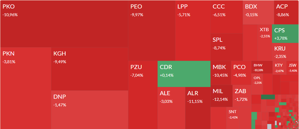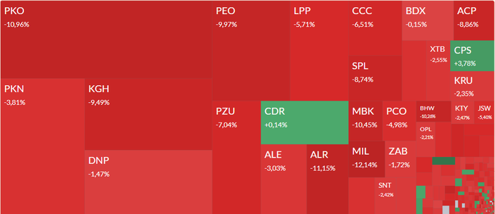 Względnie nieźle trzymają się akcje Orlenu, który traci nieco ponad 4 proc., znacznie gorzej - KGHM (-9 proc.), bo wojna handlowa nie wróży dobrze dynamice światowej gospodarki, a tym samym cenom surowców. Miedź i ropa tanieją dziś o 5-6 proc.