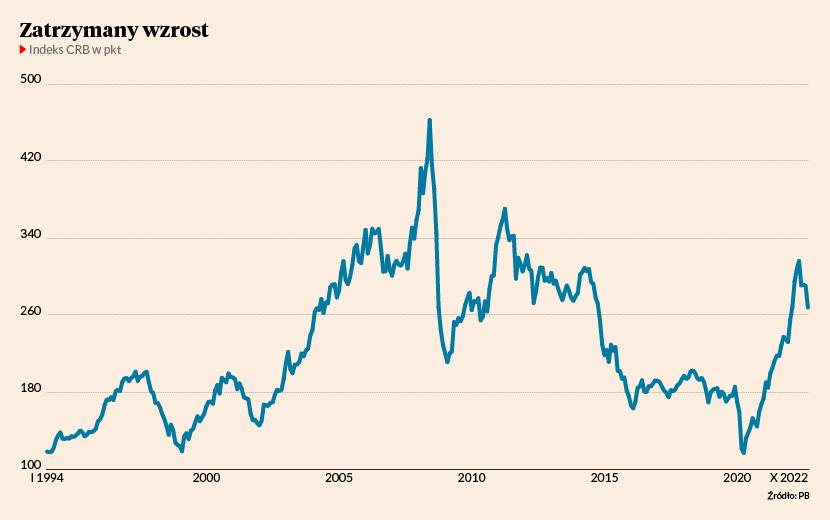 Wydarzenia z ostatnich trzech miesięcy zdają się jednak sugerować, że surowcowa hossa dobiegła końca. Wiele wskazuje na to, że pomijając kwestę gazu ziemnego w Europie ostatnia faza surowcowej paniki rozegrała się w pierwszej połowie czerwca. Tak przynajmniej sugeruje indeks CRB, mierzący ceny 19 podstawowych surowców rolnych i przemysłowych notowanych na światowych giełdach. 8 czerwca sięgnął niemal 330 pkt, wspinając się na najwyższy poziom od września 2011 r.