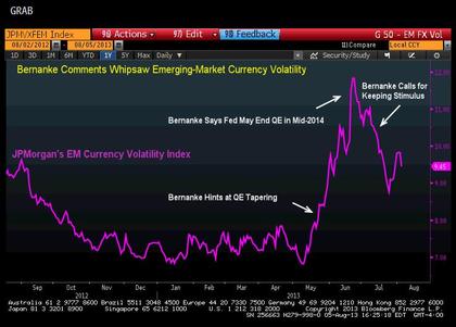 Indeks zmienności notowań walut emerging markets, tworzony przez bank JP Morgan Chase. Pierwsza strzałka wskazuje moment, kiedy Ben Bernanke pierwszy raz zasugerował zmniejszenie skali skupu aktywów, druga moment, kiedy zapowiedział, że QE może się skończyć w połowie przyszłego roku, a trzecia moment, gdy zapewniał, że zmniejszanie wsparcia wciąż jednak nie jest pewne. Źródło: Bloomberg.