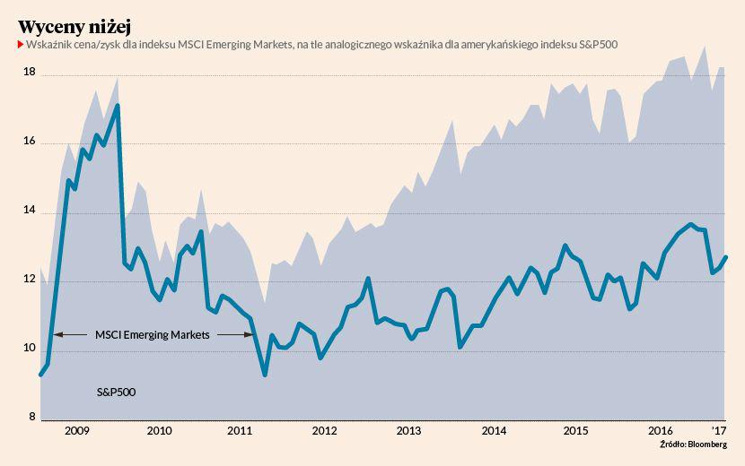 Od początku roku obliczany przez MSCI indeks giełd krajów emerging markets zyskał 12,4 proc. To blisko dwa razy mocniej od analogicznego wskaźnika rynków dojrzałych. Zdaniem specjalistów wschodzące rynki akcji, które przed zapoczątkowanym w 2016 r. odbiciem zachowywały się gorzej od dojrzałych przez pięć lat, mają dalej przyciągać inwestorów. Wzrost w tej grupie krajów odbija od dna, wyceny spółek są znacznie niższe, tendencja preferowania akcji z rynków dojrzałych się odwróciła, tłumaczy Chris Brightman z Research Affiliates, który ponad rok temu nazwał rynki wschodzące „inwestycją dekady”.