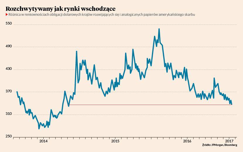 Różnica w rentownościach obligacji dolarowych krajów rozwijających się i analogicznych papierów amerykańskiego skarbu spadła w piątek najniżej od listopada 2014 r., co oznacza relatywnie lepsze zachowanie tych pierwszych papierów, wynika z obliczeń banku JPMorgan. W ciągu ostatnich 12 miesięcy większość oferowanych przez polskie towarzystwa funduszy obligacji rynków wschodzących przyniosła niskie jednocyfrowe stopy zwrotu. Najwięcej, bo 9,8 proc. dał zarobić NN Obligacji Rynków Wschodzących SFIO.
