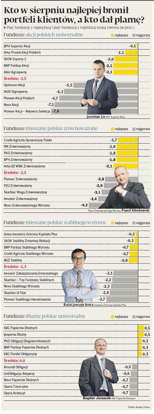 Sierpniowa przecena nie ominęła GPW, choć straty były relatywnie mniejsze niż na giełdach zagranicznych. WIG spadł o 2,8 proc., a mWIG40 i WIG20 o — odpowiednio — 3,6 i 2,9 proc. W tym czasie fundusze akcji polskich straciłyśrednio 3,5 proc., a fundusze małych i średnich spółek schudły o 3,2 proc. Dobrze na tle rywali wypadł BPH Superior, zarządzany przez Jarosława Lisa, któremu udało się ograniczyć stratę do 0,1 proc. Na drugim biegunie znalazł się Pioneer Akcji-Aktywna Selekcja i Novo Akcji, których jednostki potaniały o ponad 7 proc.