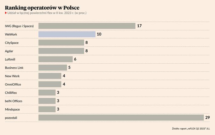 Mimo ograniczania się do stolicy WeWork z ok. 33 tys. m kw. powierzchni jest więc jednym z czołowych graczy w Polsce. Według raportu JLL na koniec półrocza operator miał drugie miejsce pod względem powierzchni, z 10-procentowym udziałem w krajowym rynku (powierzchnia flex to 335 tys. m kw. z 12,8 mln m kw. łącznej powierzchni biurowej). IWG (marki Regus i Spaces), lider rankingu, miał 17 proc., a trzecie były ex aequo CitySpace i coworkingi firmy Adgar – po 8 proc.