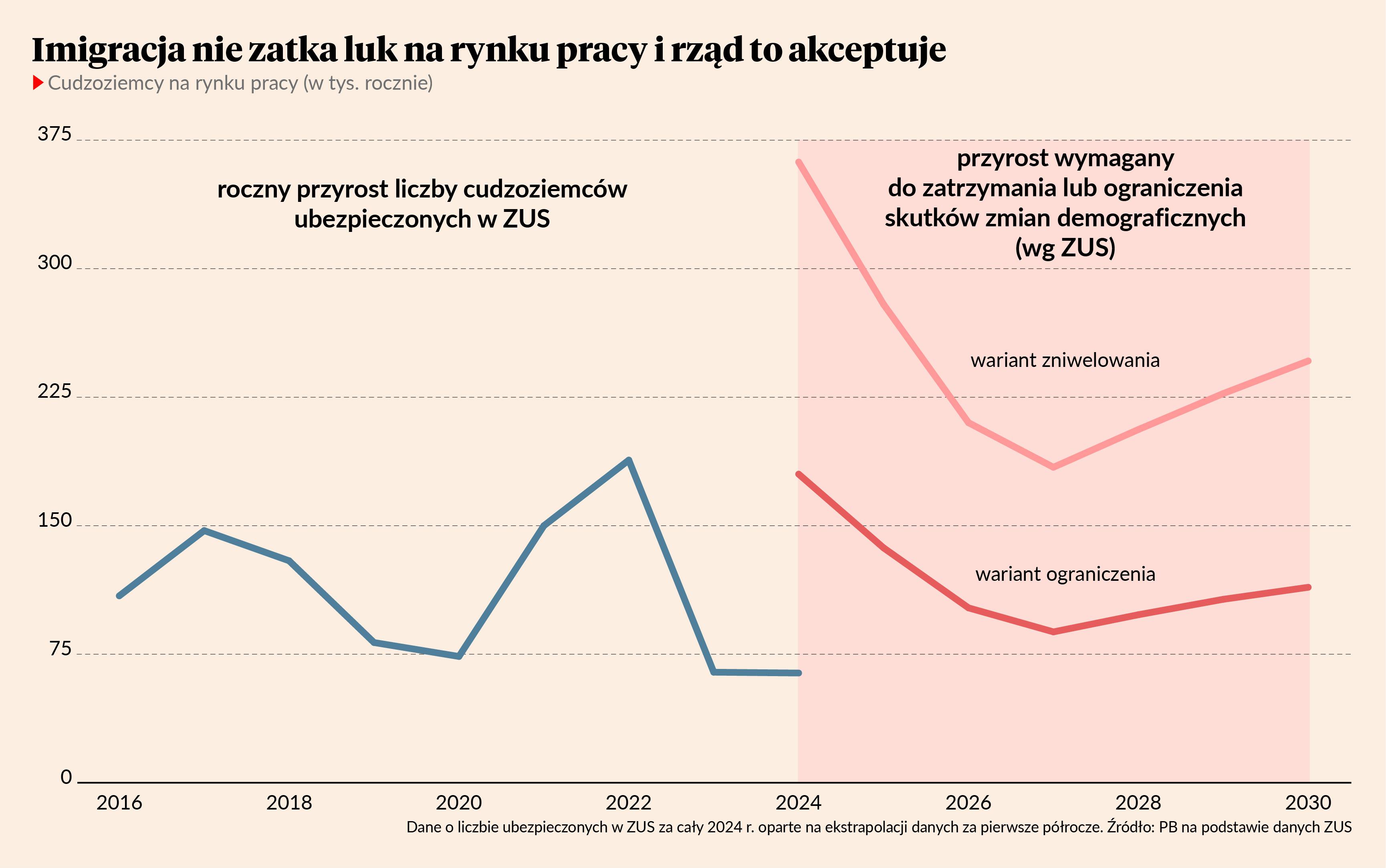 Według ZUS utrzymanie stabilnej relacji populacji w wieku produkcyjnym do populacji w wieku nieprodukcyjnym wymaga przyjęcia ponad 2,5 mln imigrantów w ciągu 10 lat. W wersji łagodniejszej oznaczałoby to przyjęcie 1,2 mln imigrantów. Tymczasem ostatnie dane pokazują, że liczba cudzoziemców na rynku pracy rośnie w tempie ok. 60 tys. rocznie, co przekładałoby się na niewiele ponad 0,5 mln w ciągu dekady. Dotyczy to wprawdzie tylko ubezpieczonych w ZUS, ale ogólny obraz nie jest prawdopodobnie bardzo odmienny (innych wiarygodnych statystyk nie ma). I patrząc na strategię rządu, można oczekiwać raczej zmniejszenia niż zwiększenia tego napływu.