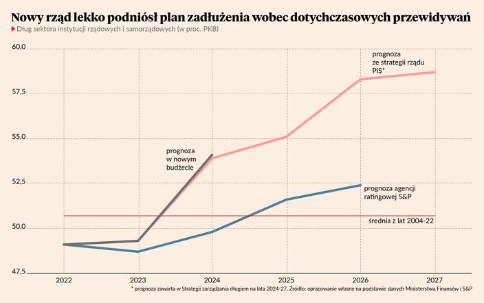 Popyt na obligacje i wiarygodność kredytowa rządu nie zależą jednak od sytuacji fiskalnej państwa w jednym roku, lecz od przewidywań na wiele lat. Będzie trudno podnosić wskaźnik długu o kilka punktów procentowych rocznie bez żadnego wiarygodnego pomysłu, jak ten proces ustabilizować w długim okresie. Dlatego rząd obiecuje oszczędności. Donald Tusk mówił w swoim expose, że Polska będzie modelowym przykładem stabilności fiskalnej. Minister Domański powtarzał podczas wtorkowej konferencji, że ministerstwo bierze się za przegląd wydatków w ministerstwach i szukanie sposobów na stopniową redukcję deficytu, a tym samym tempa przyrostu długu.