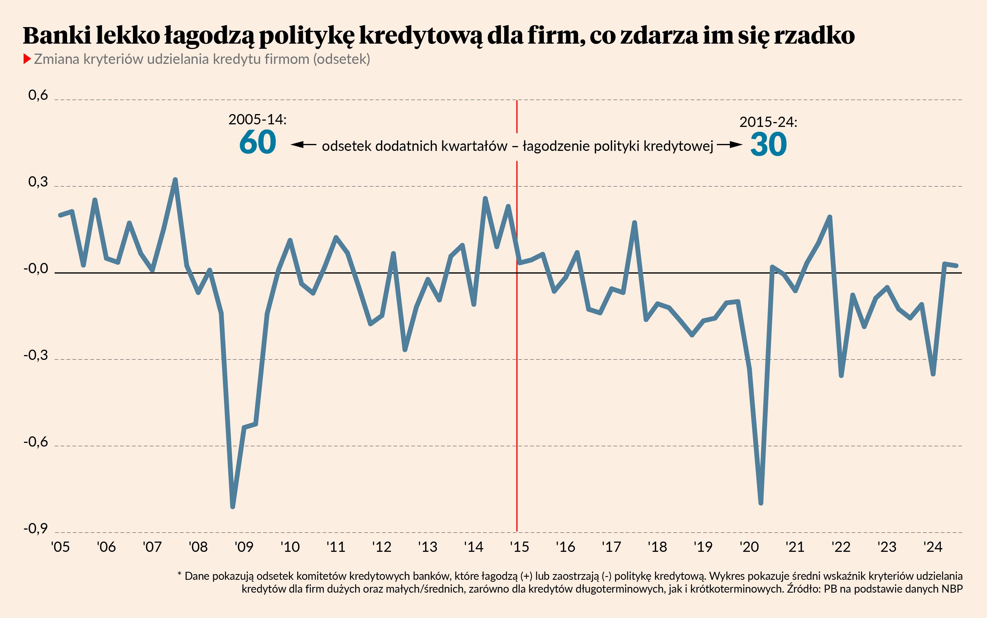 Bardzo ważne pytanie jest takie, dlaczego właściwie w Polsce banki tak rzadko łagodzą politykę kredytową? W ostatnich 10 latach było tylko 12 kwartałów, w których doszło do takiego złagodzenia (30 proc. czasu). W poprzedniej dekadzie było takich kwartałów dwukrotnie więcej (60 proc. czasu). Ten generalnie ostrzejszy front wobec biznesowych kredytobiorców współgra z redukcją wskaźników zadłużenia przedsiębiorstw. W ostatniej dekadzie relacja długu firm do PKB zmniejszyła się o 10 pkt proc., podczas gdy w poprzedniej dekadzie wzrosła o 9 pkt proc.