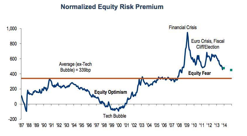 Premia za ryzyko związane z inwestowaniem w akcje, w punktach proc. Im wyższa premia, tym akcje są bardziej atrakcyjne na tle obligacji. Pomarańczowa linia oznacza średnią wartość z ostatnich 26 lat (3,39 proc.). Wartości premii poniżej średniej oznaczają optymizm inwestorów, wartości powyżej wskazują na pesymizm. Źródło: BofA, BusinessInsider.