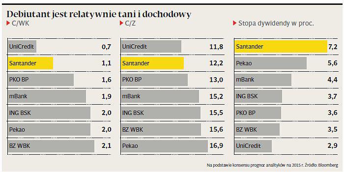 Tych inwestorów, których prawdopodobna niska płynność obrotu nie zniechęci, przyciągnąć powinny atrakcyjne wskaźniki wyceny Santandera. Pod tym względem wyraźnie bije on rodzime banki, a także włoskiego rywala. Kapitalizacja hiszpańskiego banku to nieco ponad jednokrotność wartości księgowej, wobec 1,7 dla PKO BP oraz 2-2,3 dla Pekao, ING czy BZ WBK. Wskaźnik cena do zysku (i to zarówno dla prognoz na 2014 r., jak i 2015) w przypadku Santandera również jest niższy niż dla większości polskich banków. Premię, z jaką są notowane, tłumaczyć może jednak różnica w rentowności kapitału własnego (ROE).