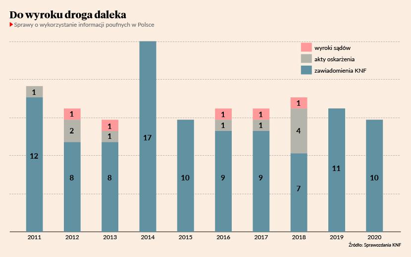 Przez ostatnią dekadę Komisja Nadzoru Finansowego kierowała do prokuratury średnio dziesięć zawiadomień roczni o podejrzeniu popełnienia przestępstwa, polegającego na wykorzystaniu informacji poufnej. Za tzw. insider trading w Polsce grozi od 3 miesięcy do nawet 5 lat pozbawienia wolności. Możliwa jest też grzywna w wysokości do 5 mln zł. Wyroków skazujących, wydanych przez sąd, jest jednak jak na lekarstwo (patrz wykres). Wiele spraw nie ogląda też światła dziennego, a tylko niektóre, kończące się sankcjami administracyjnymi, opisywane są przez nadzorcę w celach odstraszających.