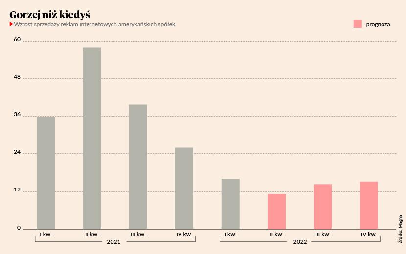 Według danych firmy Magna, amerykański rynek reklam internetowych urósł w II kwartale 2022 r. jedynie o 11 proc., w porównaniu do 58 proc. w analogicznym okresie roku ubiegłego. O wzrost najtrudniej było w kategorii reklam w mediach społecznościowych. Nowe zasady prywatności Apple’a utrudniły bowiem spółkom zbieranie danych na temat użytkowników, przez co stosowane przez nie metody stały się mniej efektywne.