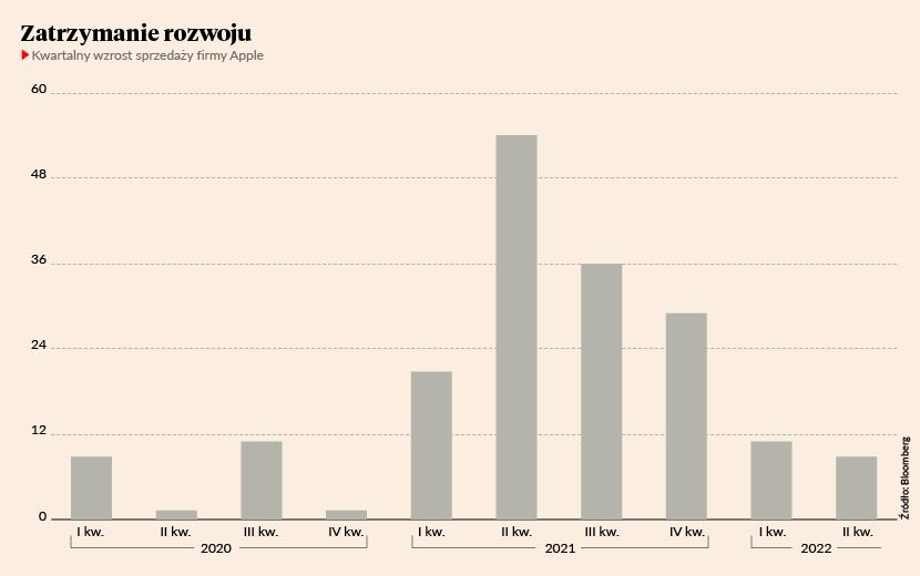 Porównania do zeszłorocznych danych będą dla spółki wyjątkowo bolesne. II kwartał 2021 r. wiązał się z rekordowym wzrostem sprzedaży, wynikającym z zaopatrywania się domostw w sprzęt potrzebny do pracy zdalnej. Jedynego wzrostu w wynikach Apple’a za II kwartał 2022 r. można będzie szukać w usługach internetowych. Analitycy przewidują rekordowe 20 mld USD zysku z tej działalności.