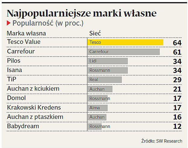 W badaniu ankietowani mieli do wyboru 25 linii marek własnych 15 sieci handlowych. Dół tabeli rozpoznawalności okupowały marki elektroniczne (Koenic – Media Markt) i sportowe (Btwin – Decathlon). Według szacunków PMR, rynek marek własnych w Polsce jest wart już 41,4 mld zł.