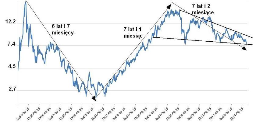 Zważywszy, że do końca klina pozostało już mało miejsca, wykres powinien w dalszej perspektywie wybić się z formacji. Jego cykliczność w ostatnich latach (blisko 7 lat spadkowych, 7 lat wzrostowych i obecnie nieco ponad 7 lat spadkowych) przemawia za tym, że będzie to wybicie górą. W takim wypadku będzie można się spodziewać, że stosunek relacji WIGu i S&P500 sięgnie w perspektywie kilku lat wartości 12. To oznaczałoby nowy szczyt wszech czasów na warszawskiej giełdzie, właściwie niezależnie od koniunktury w za oceanem, oraz relatywnie lepsze zachowanie krajowych indeksów przez kolejne 7 lat.