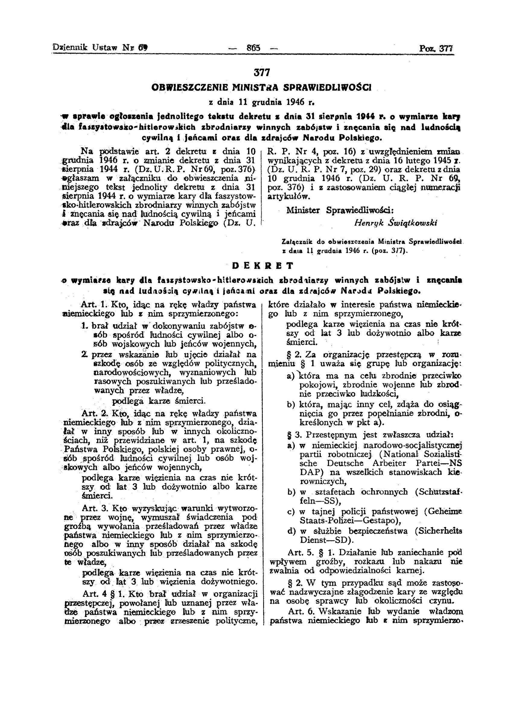 Wprowadzony 31 sierpnia 1944 r. dekret obowiązywał od 13 września tamtego roku i po kilkakrotnych zmianach (np. w 1998 r. zamieniono karę śmierci na dożywotnie więzienie) wobec zbrodniarzy nazistowskich obowiązuje do dziś.