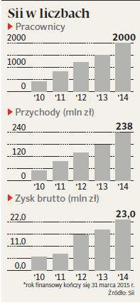 W tym roku Sii nie otworzy nowego oddziału w kolejnym mieście. — Rozwiniemy natomiast IT Delivery Center w Łodzi, podobnie, jak jest w Lublinie. Oprócz oddziału, który świadczy usługi dla klientów, będziemy mieć centrum świadczące usługi dla innych oddziałów Sii. Będą tam rozwijane kompetencje: .net, Java i SharePoint. Najbliższe plany zatrudnienia z nowym Delivery Center to 30 osób — opowiada prezes Sii. Spółka walczy też o zlecenia z sektora administracji publicznej. W ubiegłym roku wygrała m.in. z Comarchem kontrakt dla Ministerstwa Sprawiedliwości. W kilka lat chce mieć na tym rynku taką pozycję, jak Asseco, Comarch czy Sygnity. © Ⓟ