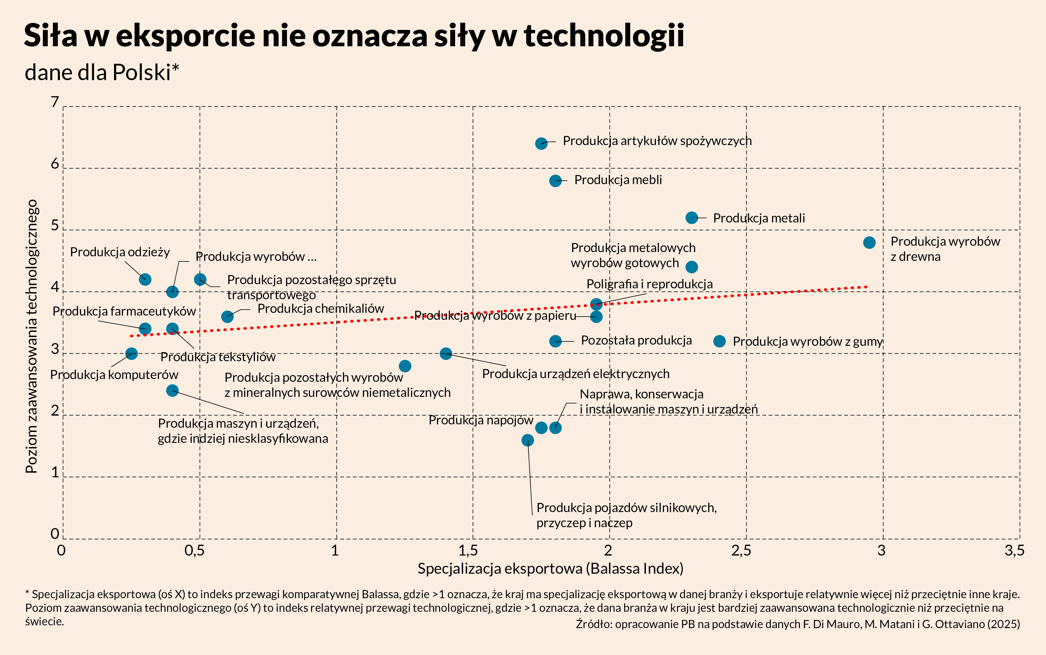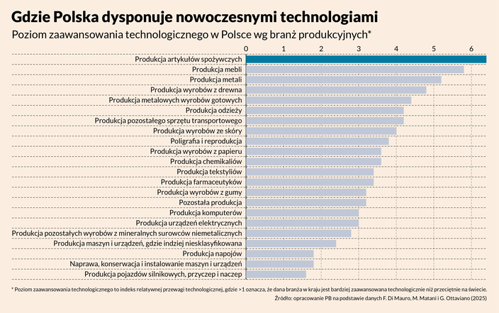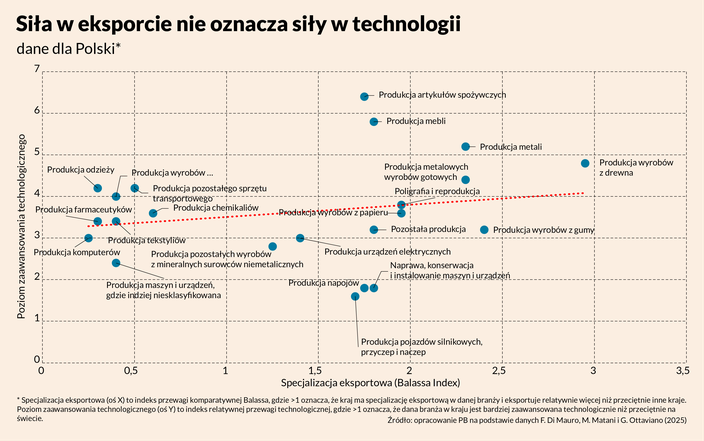 Na czym opierają swoje wnioski? Sprawdzili to empirycznie. Opracowali indeks relatywnej przewagi technologicznej dla krajów UE, a następnie zestawili go z indeksem przewagi komparatywnej - miarą tego, w czym dany kraj rzeczywiście dominuje na światowych rynkach. Okazuje się, że nie istnieje silny i istotny statystycznie związek między obiema zmiennymi w analizowanych państwach, czyli siłą eksportu oraz siłą technologii w danej branży. Dla Polski na przykład współczynnik regresji wynosi 0,004 i jest nieistotny statystycznie, a współczynnik korelacji to 0,2.