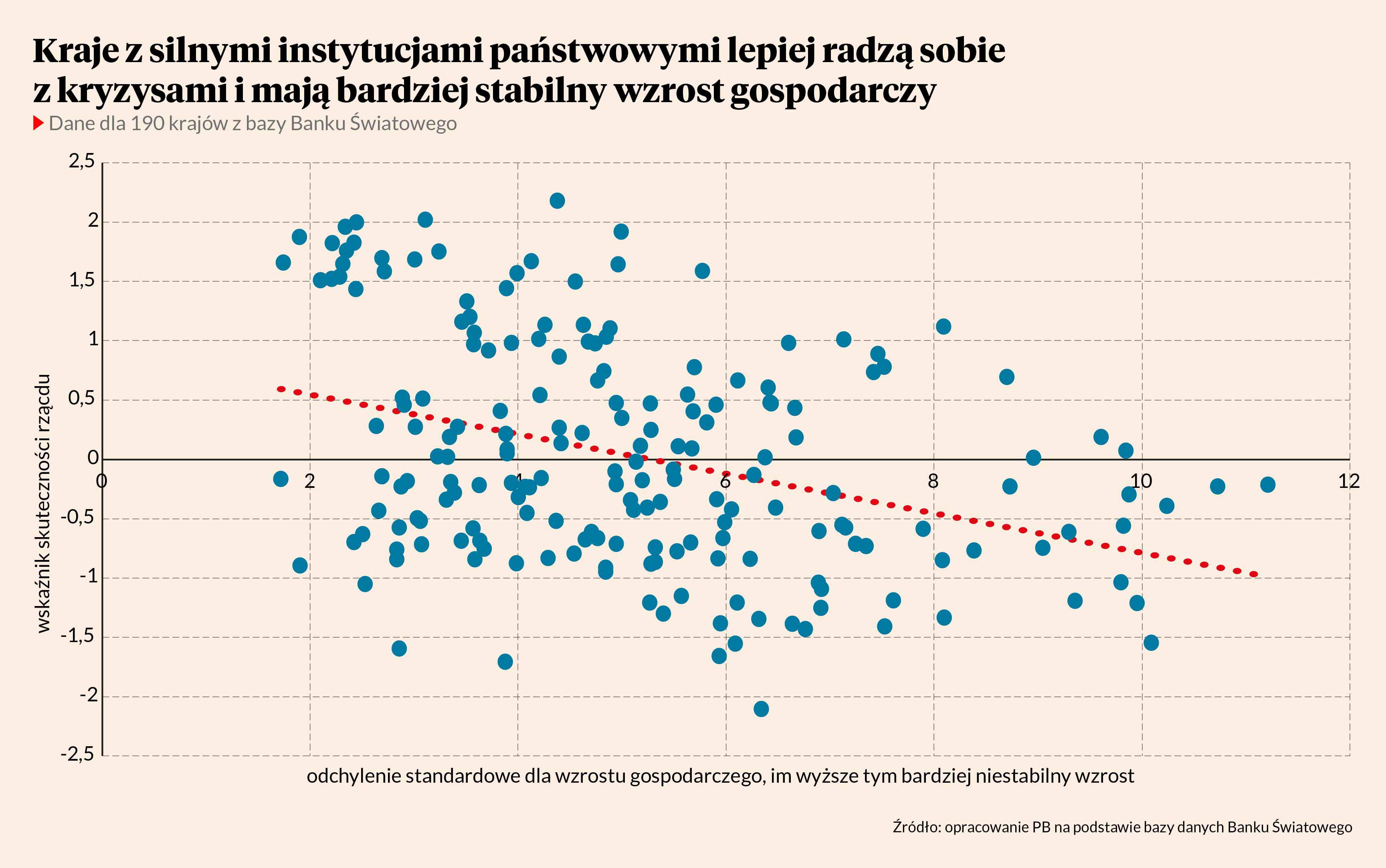 Warto zwrócić uwagę na wykorzystanie przez badaczy nowatorskiej metodologii – badają oni nie tyle zależność między instytucjami a poziomem rozwoju kraju, co relację między ewolucją instytucji a wzrostem gospodarczym. Pozwala to precyzyjniej określić przyczynowość i sekwencję zdarzeń, np. erozję otoczenia instytucjonalnego poprzedzającą długotrwałą stagnację. Powtarzalność takich sekwencji w analizowanych państwach doprowadziła autorów do wniosku, że systemy demokratyczne o wysokiej skuteczności instytucji państwowych mają większe szanse na wysoki, stabilny wzrost gospodarczy w długim okresie. Z kolei kombinacja niskiej skuteczności państwa i rządów autokratycznych zazwyczaj zwiastuje okres gospodarczych turbulencji. Mniej wyrafinowana metoda badawcza (korelacja między wskaźnikiem skuteczności rządu a historyczną zmiennością dynamiki wzrostu PKB) też potwierdza, że gospodarki z silniejszymi instytucjami państwowymi charakteryzują się stabilniejszym wzrostem. Aczkolwiek korelacja nie kontroluje problemu endogeniczności, czyli faktu, że to niestabilny wzrost może wpływać na jakość państwa, a nie jakość państwa na wzrost.