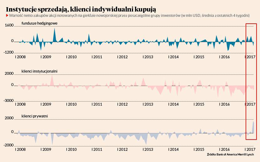 Zakupy akcji notowanych na giełdzie nowojorskiej przez klientów indywidualnych banku BofA ML utrzymują się na najwyższych poziomach od co najmniej dekady, oblicza instytucja. W optymizmie ta grupa jest jednak odosobniona. Klienci instytucjonalni już od 12 miesięcy sprzedają więcej akcji niż kupują, a w ostatnich tygodniach dołączyły do nich fundusze hedgingowe. Podobną tendencję zauważył także Nikolaos Panigirtzoglou z banku JPMorgan, przypominając że dystrybucja aktywów z silnych rąk do inwestorów indywidualnych jest zwykle sygnałem zbliżania się końca hossy.