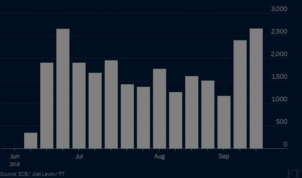 Wartość obligacji korporacyjnych skupionych przez EBC w kolejnych tygodniach. Źródło: ft.com.