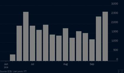 W ubiegłym tygodniu EBC skupił obligacje korporacyjne na kwotę 2,66 mld EUR. To oznacza największe zakupy od rozpoczęcia w czerwcu skupu tego typu aktywów, a do tej pory na zakupy papierów korporacyjnych wydano łącznie 25,6 mld EUR. EBC zaskoczył inwestorów intensywnością swoich zakupów, a rynkowe efekty tego trudno przeoczyć, komentuje Financial Times. Średnie rentowności obligacji korporacyjnych w strefie euro sięgnęły we wrześniu rekordowo niskiego pułapu 0,6 proc., podczas gdy jeszcze rok temu wynosiły 1,5 proc., a wartość emisji zaczęła rosnąć.
