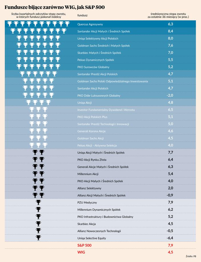 Liderem rankingu pozostaje Quercus Agresywny, zarządzany przez Sebastiana Buczka. W ostatnich 36 miesiącach WIG pokonał wyraźnie, ale S&P 500 okazała się dla niego za dużym wyzwaniem, mimo że wcześniej punktował nawet wtedy, gdy to S&P 500 radził sobie lepiej od benchmarku z GPW. Symbolicznego pucharu za mistrzostwo zarządzania Quercus Agresywny nie zdobył więc po raz pierwszy. Ma ich jednak wciąż najwięcej, a to liczba pucharów, a nie stopa zwrotu jest podstawą zestawienia. Celem rankingu jest bowiem wskazanie funduszy dających względną rękojmię dobrego zarządzania pieniędzmi klientów w dłuższym okresie, a nie promowanie tych, którym splot dość przypadkowych okoliczności pozwolił akurat wykręcić stopę zwrotu lepszą od konkurencji. Właśnie dlatego PZU Medyczny mimo dobrego wyniku za ostatnie 36 miesięcy znajduje się w grupie zamykających zestawienie, a nie na jego początku.