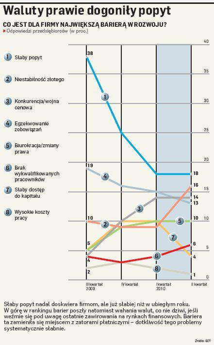 W ostatnim kwartale przedsiębiorców mocno dotknęły też wahania na rynku walut - jako główną barierę wskazuje je aż 16 proc. firm. To największy odsetek ze wszystkich czterech edycji badania. W ostatnich miesiącach złoty uderzył zarówno w eksporterów, jak i importerów. Najpierw systematycznie się umacniał (ograniczając rentowność zagranicznej sprzedaży), a potem nagle gwałtownie stracił na wartości (odbierając zyski firm zajmujących się importem).