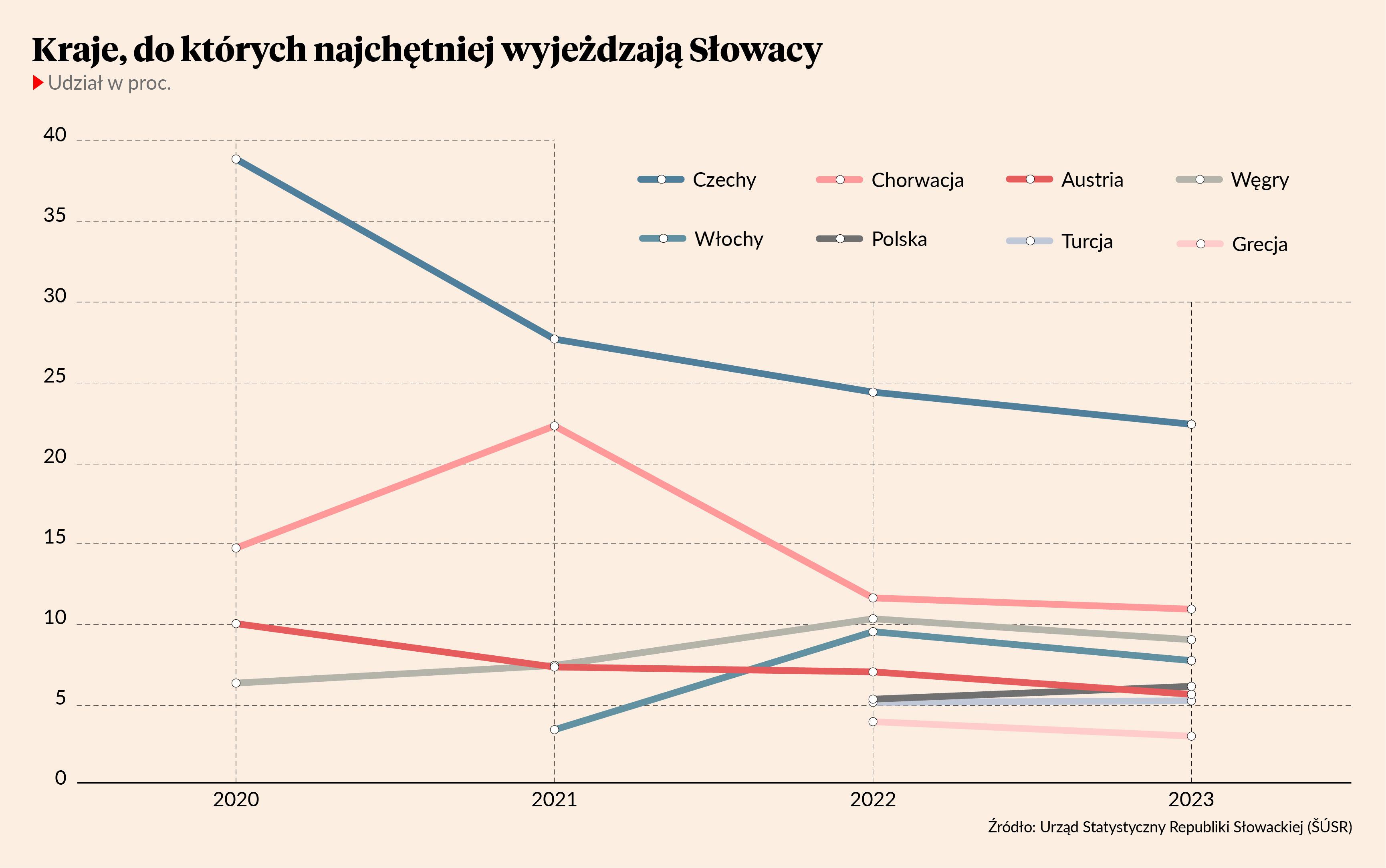 Jeszcze trzy lata temu Urząd Statystyczny Republiki Słowackiej (ŠÚ SR) w ogóle nie ujmował naszego kraju w statystykach dotyczących zagranicznych wyjazdów Słowaków. Polska pojawiła się dopiero w tabelach obejmujących dane ŠÚ SR za 2022 r. Była wtedy szóstym najchętniej wybieranym przez Słowaków kierunkiem zagranicznych wyjazdów. W zeszłym roku nasz kraj awansował o jedną pozycję, przeskakując przy tym Austrię, tradycyjnie jeden z ulubionych kierunków wyjazdów Słowaków (Bratysława to jedyna na świecie stolica, która graniczy z dwoma państwami – z Węgrami i właśnie z Austrią).