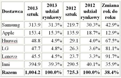 Udział południowokoreańskiego Samsunga zwiększył się o 1 proc. do 31,3 proc. umacniając firmę na pozycji światowego lidera. Tymczasem największy rywal, Apple zmniejszył – mimo rekordowych wyników - stan posiadania do 15,3 proc. Rok wcześniej Amerykanie mieli 18,7 proc. rynku.