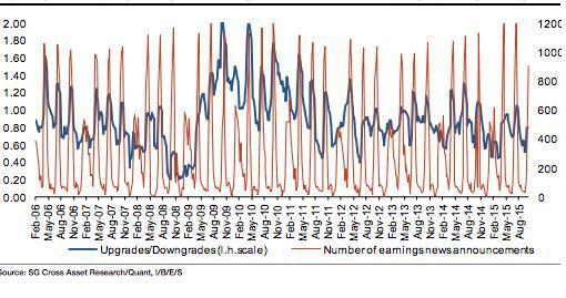 Proporcja liczby podwyżek do liczby obniżek prognoz wyników (linia niebieska, im wyższy odczyt, tym więcej podwyżek) na tle liczby raportujących spółek (linia czerwona). Zwykle podwyżki prognoz zbiegają się z czasem trwania sezonu wyników. Źródło: Societe Generale, Ftalphaville.
