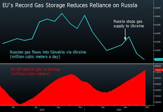 Jak wynika z danych stowarzyszenia Gas Infrastructure Europe, unijne rezerwy gazu osiągnęły we wrześniu rekordowy poziom 73,2 mld metrów sześciennych. Napełnienie zbiorników na Słowacji, która należała do krajów najbardziej dotkniętych zakłóceniami w dostawach z 2009 r., sięgnęło 92 proc. Po tym, jak zbiorniki były intensywnie napełniane wiosną, import rosyjskiego paliwa spowolnił w lipcu i sierpniu.