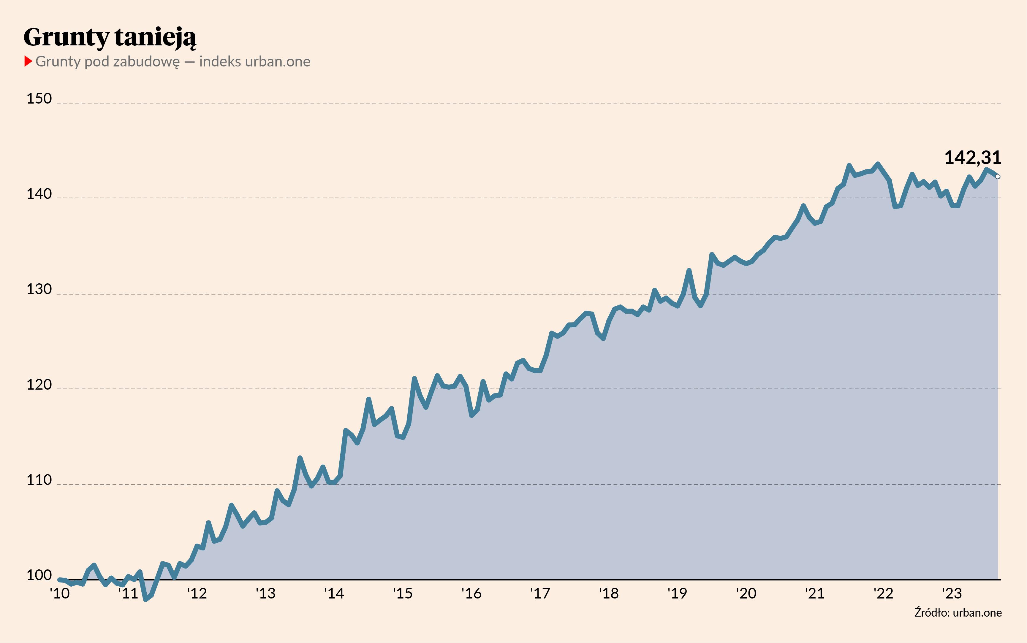 Z danych Cenatorium wynika, że we wrześniu potaniały grunty pod zabudowę. Indeks urban.one dla tego segmentu obniżył się o 0,43 pkt, do 142,31 pkt. Według prawie 60 proc. badanych nadchodzące miesiące ustabilizują sytuację na tym rynku. Pozostali wieszczą pogorszenie. Po raz kolejny żaden z ankietowanych nie prognozuje poprawy.