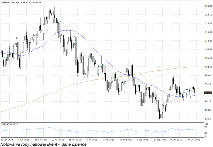 Słaby początek tygodnia na rynku ropy to m.in. efekt rozczarowujących danych makroekonomicznych z Chin. Dzisiejsze odczyty indeksów PMI dla przemysłu i usług wg CFLP za październik znalazły się na poziomach nieprzekraczających 50 pkt., co oznacza spadek aktywności obu sektorów. Był to odczyt niższy od oczekiwań, zakładających jednak przekroczenie poziomu 50 pkt.