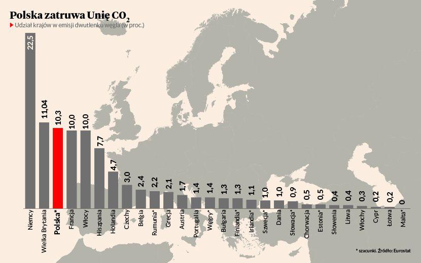Warto także spojrzeć w zestawienie Eurostatu przez pryzmat udziału poszczególnych krajów w emisji CO2. W tym przypadku stawce nadal przewodzą Niemcy mające aż 22 proc. udział w 2018 r. Druga była Wielka Brytania z wynikiem prawie połowę niższym (11,4 proc.), zaś trzeci Polska, której emisja CO2 w całości została podliczona na 10,3 proc.