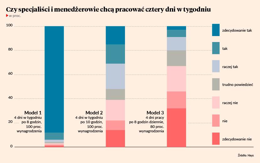 Badani są za nowym modelem, o ile nie musieliby pracować więcej niż osiem godzin dziennie i dostawaliby 100 proc. wynagrodzenia. Mniej jest chętnych do pracy po 10 godzin dziennie, a w przypadku obniżki wynagrodzenia o 20 proc. aż 67 proc. traci zainteresowanie nowym rozwiązaniem.