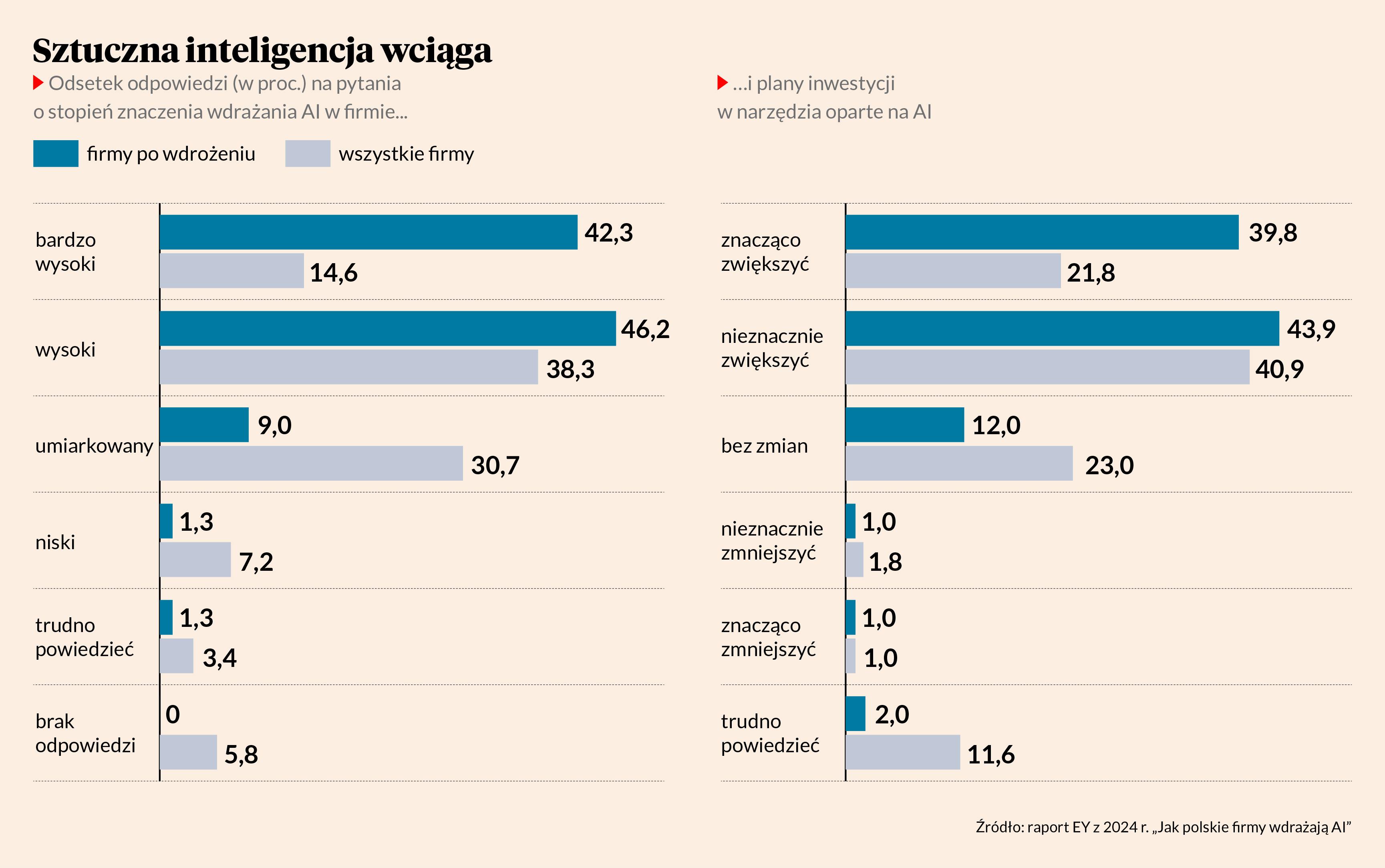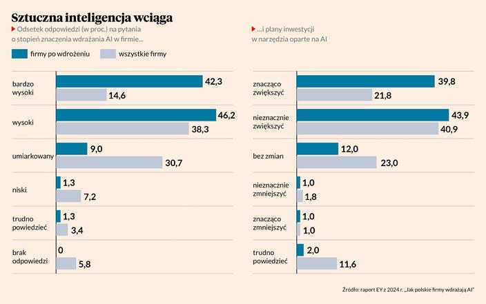 Co piąta polska firma wdrożyła już jakieś rozwiązanie oparte na sztucznej inteligencji, większość jest w trakcie lub analizuje możliwości, a tylko 9 proc. nie planuje tego w ciągu dwóch lat – wynika z raportu EY „Jak polskie firmy wdrażają AI?”. Mniej więcej co czwarty podmiot posiłkuje się w tym zakresie wyłącznie własnym zasobem, pozostałe korzystają w części lub w całości ze wsparcia doradców. Wśród najczęściej wskazanych motywacji wdrażania AI wskazują usprawnienie lub automatyzację procesów zewnętrznych (40 proc.) oraz możliwość lepszego dotarcia do klientów (34 proc.). Nowe usługi na bazie sztucznej inteligencji chce wprowadzać 17 proc. firm. Zamierzone korzyści osiągnęło 80 proc. ankietowanych, a 14 proc. jeszcze tego nie przeanalizowało.